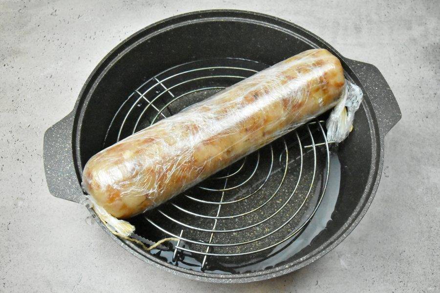 После закипания жидкости, уменьшите огонь, накройте посуду крышкой и варите на минимальном огне 1,5-2 часа. Извлеките рулет, остудите и уберите в холодильник для стабилизации.