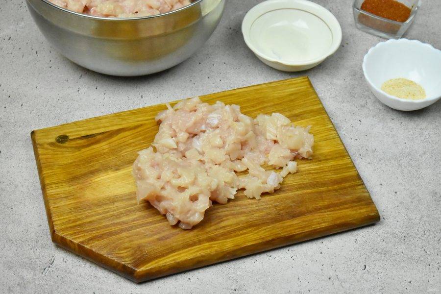 Филе куриной грудки промойте и просушите. Зачистите мясо от жира, соединительной ткани и сухожилий. Нарубите ножом на кусочки небольшого размера.