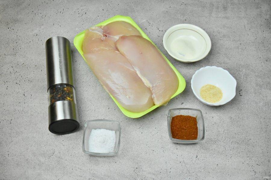 Подготовьте продукты для приготовления рулета из мяса птицы. Используйте специи на свое усмотрение и вкус.