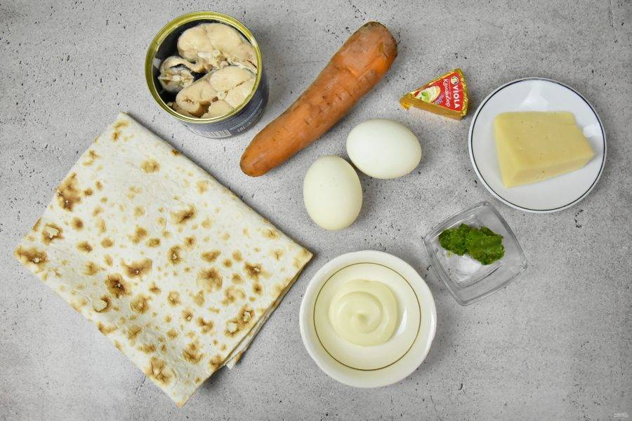 Подготовьте продукты для приготовления закусочного рулета. Если у вас большой один лаваш, используйте всю его поверхность и выкладывайте ингредиенты поочередно по всей длине. Если несколько лавашей круглых и небольших, начинку выкладывайте послойно. Морковь отварите до готовности, остудите и очистите от кожуры. Отварите яйца в течение 10 минут с момента закипания, залейте холодной водой и очистите от скорлупы. В качестве дополнения к соусу используйте любую свежую или замороженную зелень и специи по вкусу. Для хрустящей текстуры рекомендую добавить в рулет слой листьев салата.