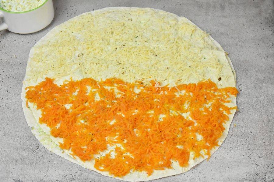 Сверху, на рыбу, выложите второй лаваш, смажьте его частью соуса, распределив его тонким слоем. На одну половину выложите слой натертой отварной моркови. Предварительно морковь слегка посолите и поперчите. На второй половине лаваша распределите слой натертого на терке сыра.