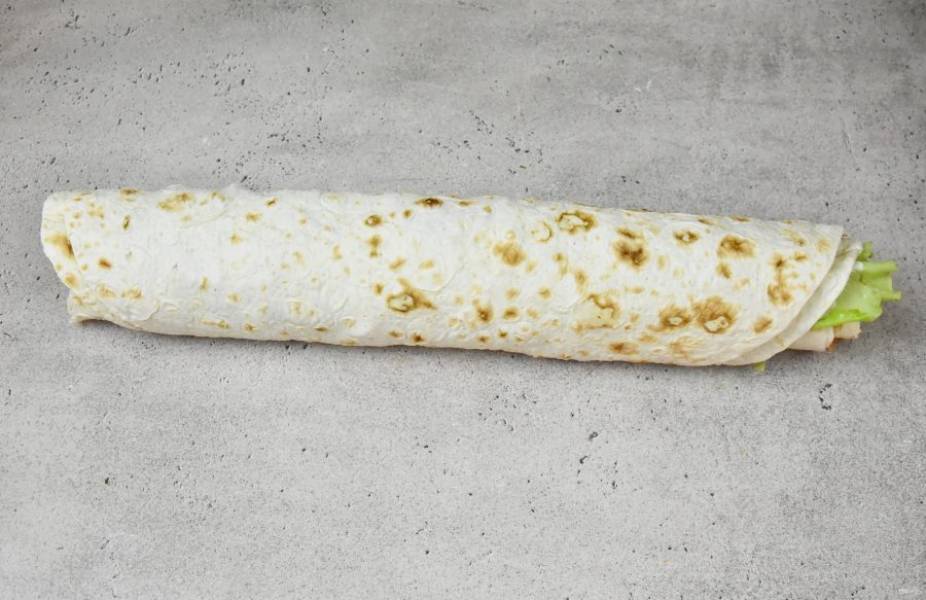 Аккуратно сверните лаваш с начинкой в плотный рулет.