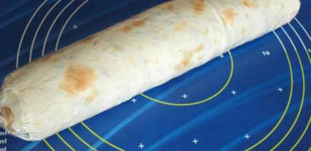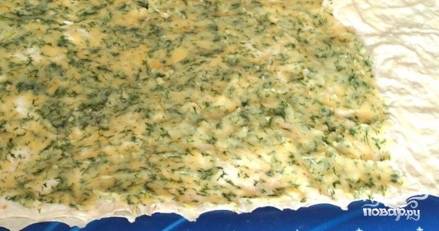 Второй лист лаваша кладите поверх первого и на две третьих смажьте картофельным пюре. Оставшуюся часть смажьте плавленым сыром – это послужит хорошим скреплением на финальном этапе.