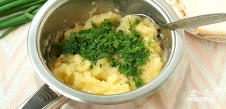 Предварительно очищенный картофель сварите в слегка подсоленной воде, разомните в пюре, добавьте мелко нарезанный укроп и размешайте.