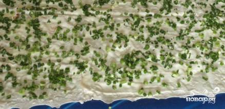 Мелко порежьте лук. Лист лаваша смажьте плавленым сыром комнатной температуры и покройте измельченным луком.