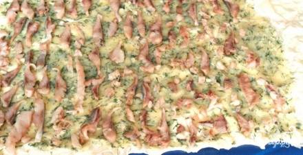 Аккуратно, медленно сверните рулет. Обмотайте его пищевой пленкой и охладите в холодильнике в течении двух часов. Перед подачей нарежьте кусочками. Приятного аппетита!