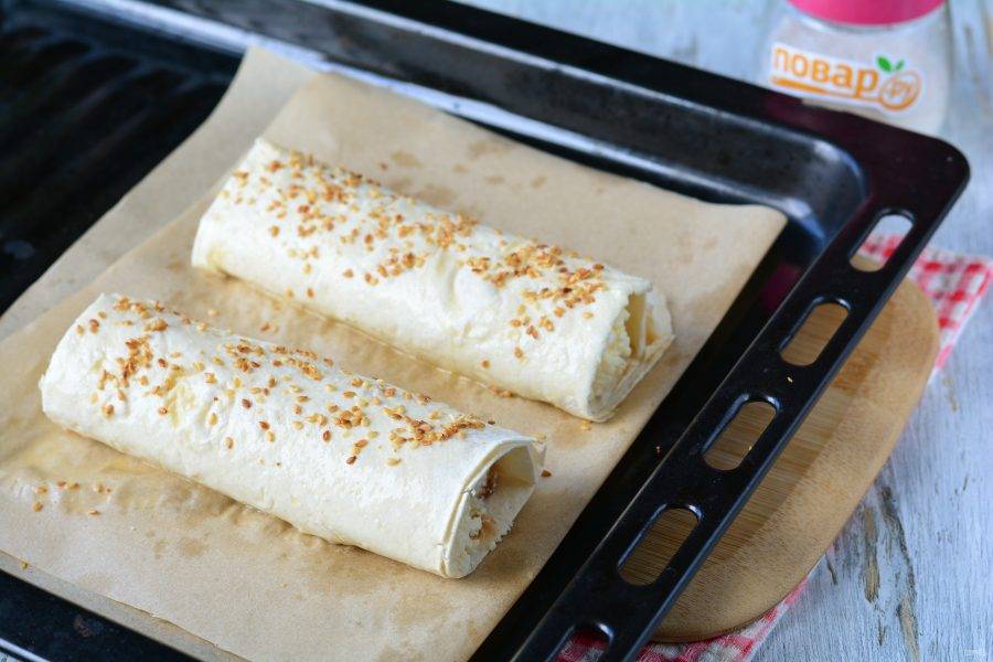 Выложите рулеты на противень, смажьте взбитым яйцом и присыпьте кунжутом.