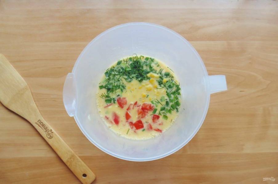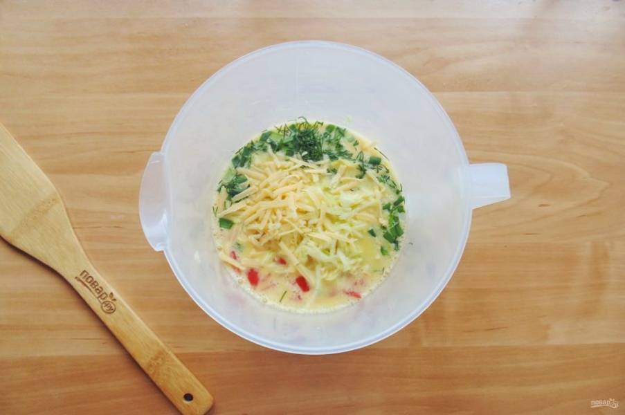 Смесь яиц, сметаны, овощей и сыра посолите по вкусу и хорошо перемешайте.