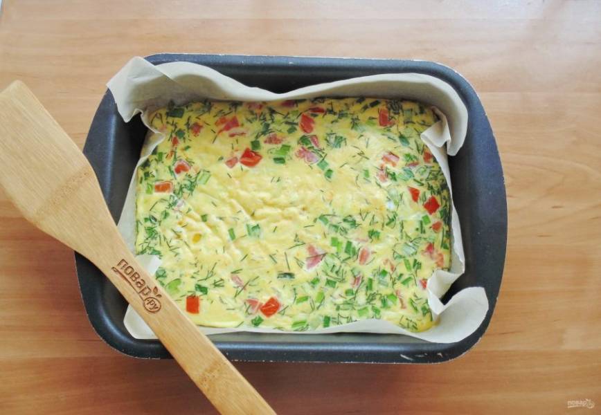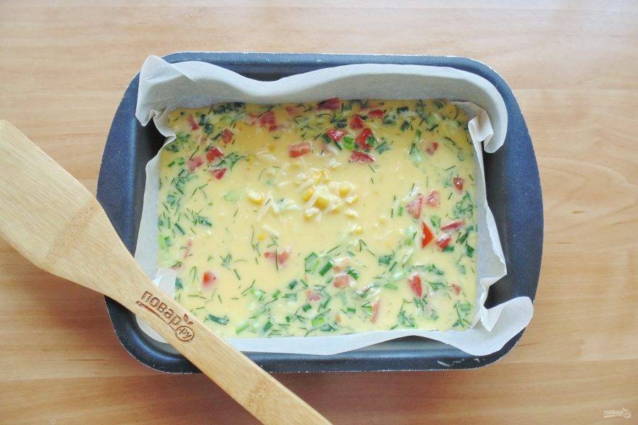 В форму для запекания выложите пекарскую бумагу, смазанную маслом. Заполните её приготовленной яично-овощной смесью. Размеры моей формы 20х25 сантиметров.