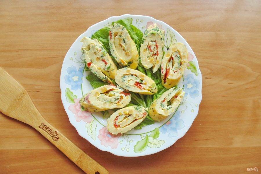 Сочный, нежный и вкусный рулет из омлета с овощами подавайте к столу в теплом или остывшем виде.