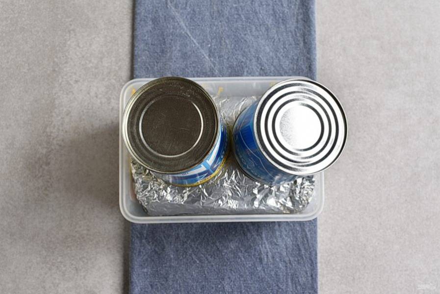 Достаньте готовый рулет и выложите в подходящую форму, не разворачивая фольгу. Сверху установите легкий груз. Дайте остыть, затем уберите в холодильник на ночь.