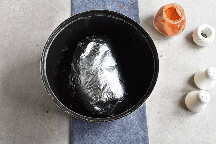 Упакуйте рулет в фольгу и выложите в мультиварку. Влейте стакан горячей воды. Поставьте режим запекания и время – 20 минут. Через 20 минут поставьте температуру 95 градусов и оставьте еще на час.