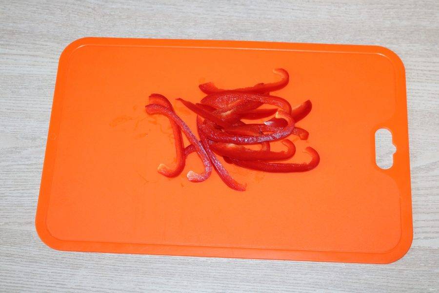 Перец сладкий нарежьте длинными полосками, перец острый нарежьте колечками, огурец нарежьте соломкой.
