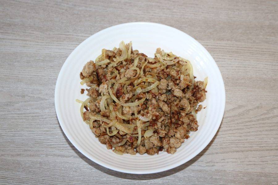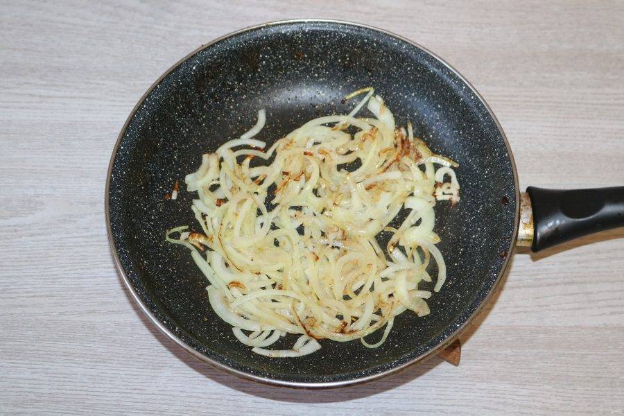 Лук обжарьте до золотистого цвета в сковороде с добавлением небольшого количества масла.