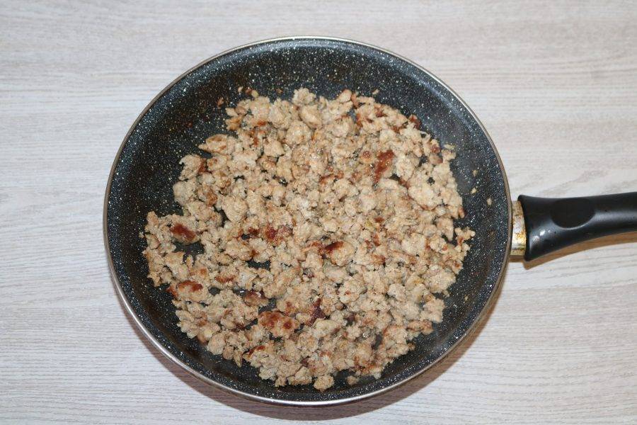 Фарш посолите, поперчите. Обжаривайте до готовности.