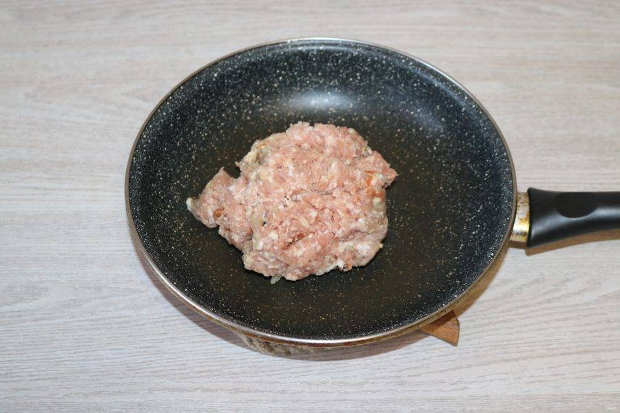 Фарш выложите на разогретую сковороду, распределите и обжаривайте на среднем огне.
