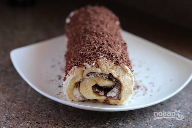 12. И по желанию присыпьте шоколадом. Перед подачей оставьте рулетик на несколько часов для пропитки. Приятного чаепития!