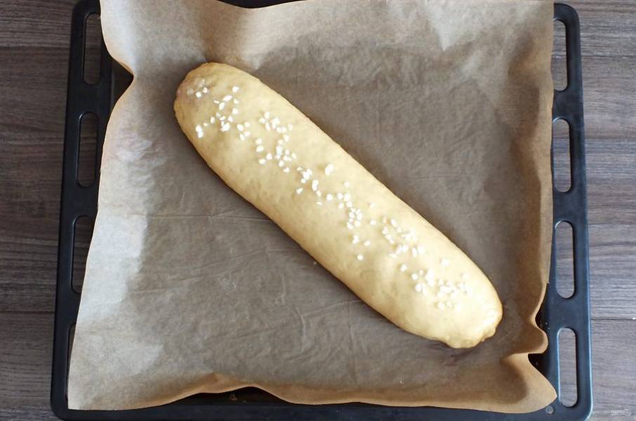 Взяв за противоположные концы пекарской бумаги, аккуратно перенесите рулет на противень. Смажьте его отложенным заранее желтком, посыпьте верх сахаром. Поставьте выпекаться в разогретую до 180 градусов духовку на 35-40 минут. Учитывайте особенности своей духовки.