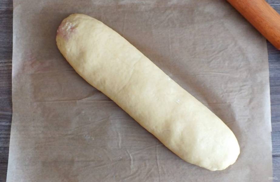 Возьмите лист пекарской бумаги. Слегка присыпьте его мукой. Переложите на него тесто.