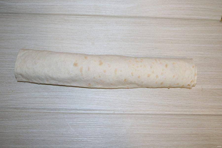 Заверните лаваш плотно в рулет. Оберните пищевой пленкой и отправьте в холодильник на 1-2 часа.