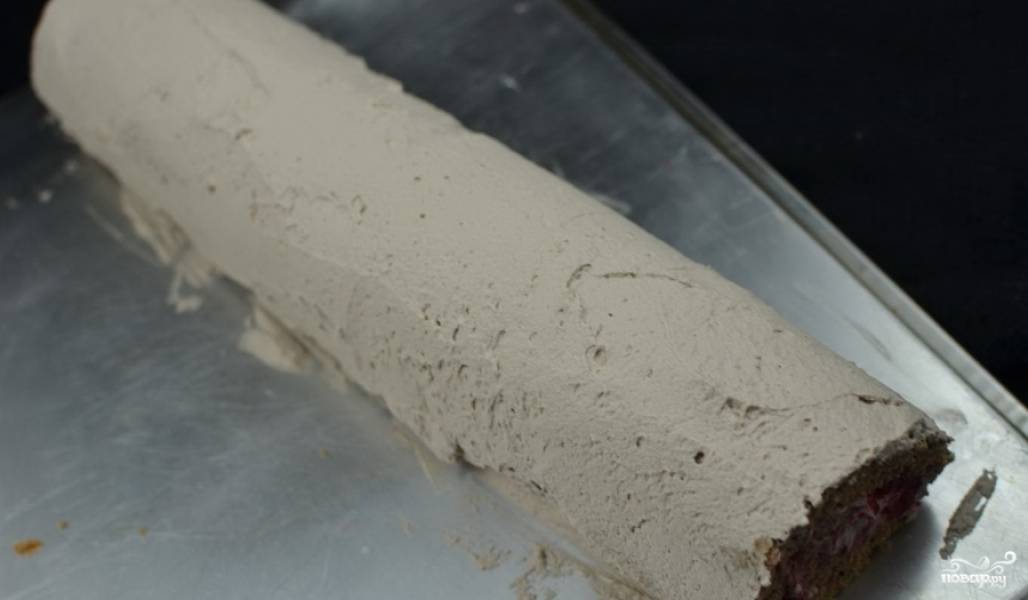 Смешиваем вместе взбитые сливки (они должны быть холодными), сгущенное молоко, какао. Все можно немного взбить миксером. Наносим немного крема на начинку, затем сворачиваем рулет и обильно обмазываем его со всех сторон.