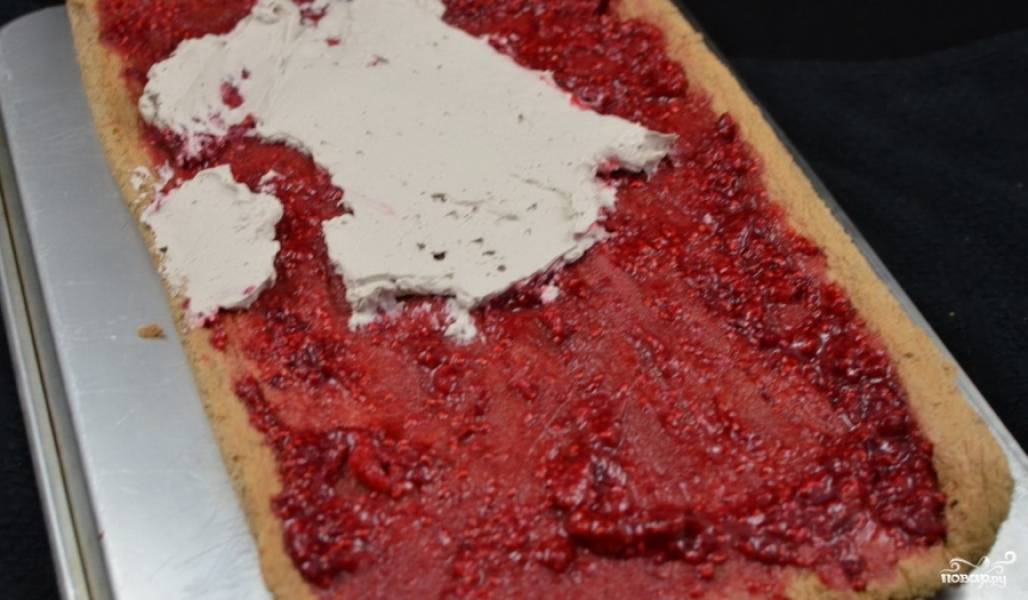 Затем основу разворачиваем и обильно смазываем тертой малиной или малиновым вареньем. Начинке даем время впитаться и в это время готовим крем.