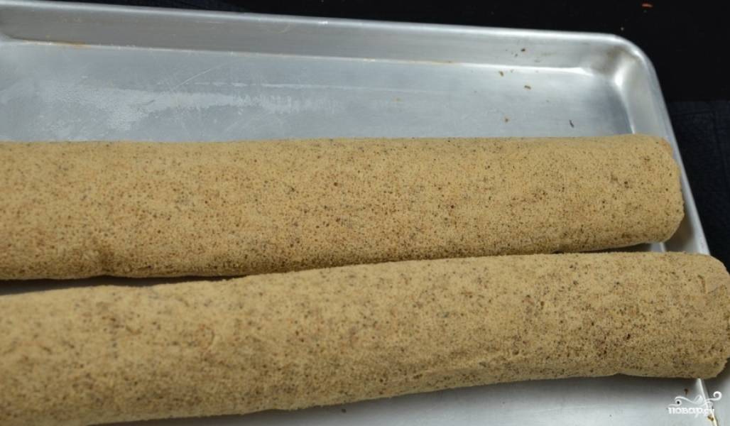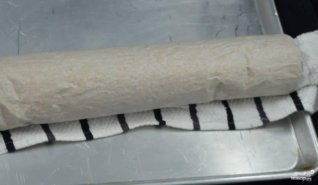 Затем на получившуюся основу рулета кладем полотенце и сворачиваем его в трубочку, даем таким образом остыть до комнатной температуры.