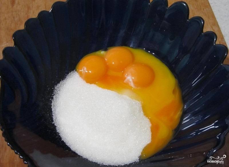 2. Желток отделяем от белка, отправляем его в миску, к нему всыпаем сахар. Просеиваем муку, порционно добавляем ее, вымешиваем тесто.