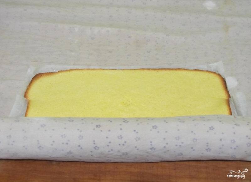 6. Выпекаем бисквит в духовом шкафу при температуре 200 градусов около двадцати минут. После приготовления перекладываем готовый бисквит вместе с пергаментом на полотенце.