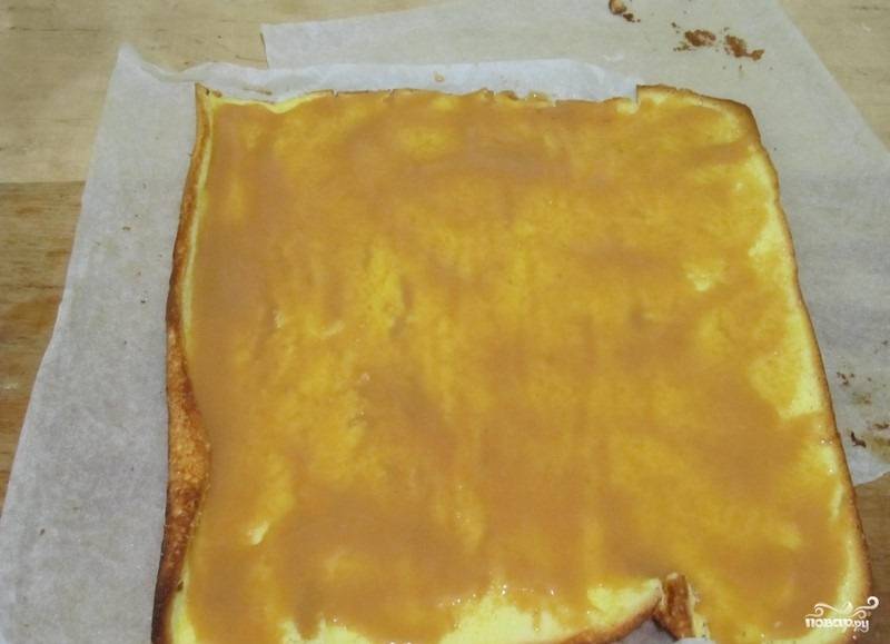 8. Разворачиваем рулет, смазываем его вареным сгущенным молоком.