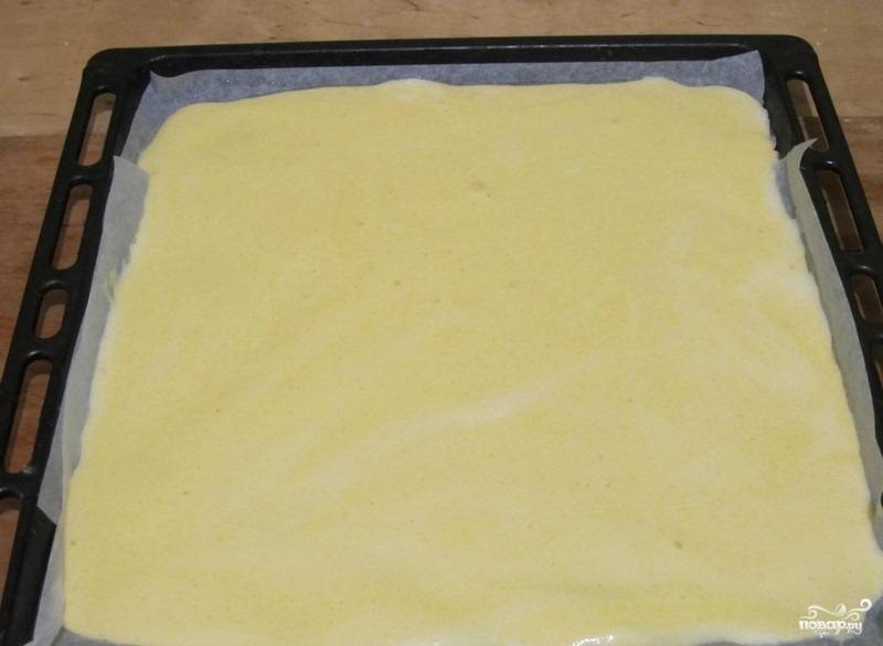 5. Противень застилаем бумагой для выпечки и смазываем маслом. Выливаем на него бисквитное тесто.