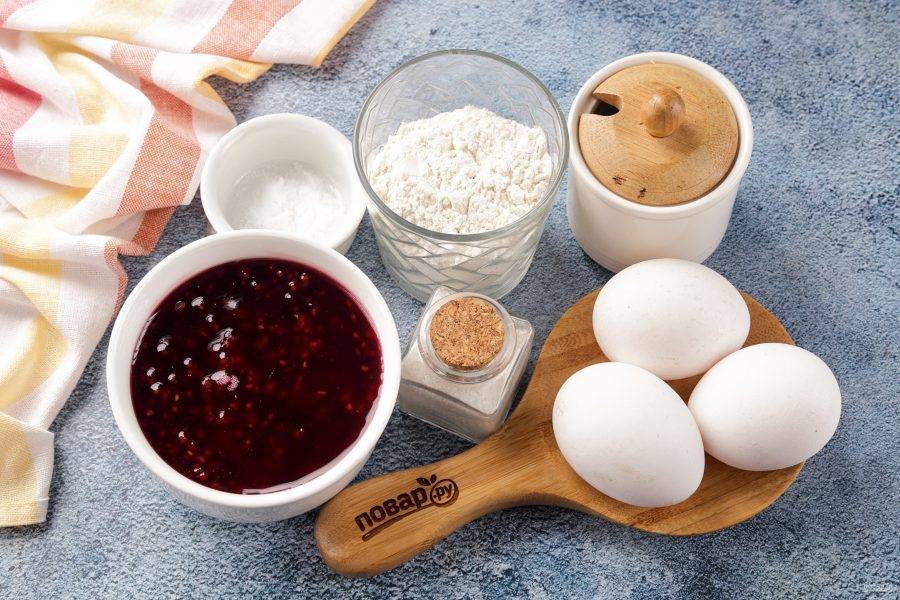 Подготовьте все ингредиенты. У меня для начинки густое варенье из малины. Вы можете взять любое другое варенье, можно варёную сгущёнку, шоколадную пасту, что есть в данный момент в холодильнике.
