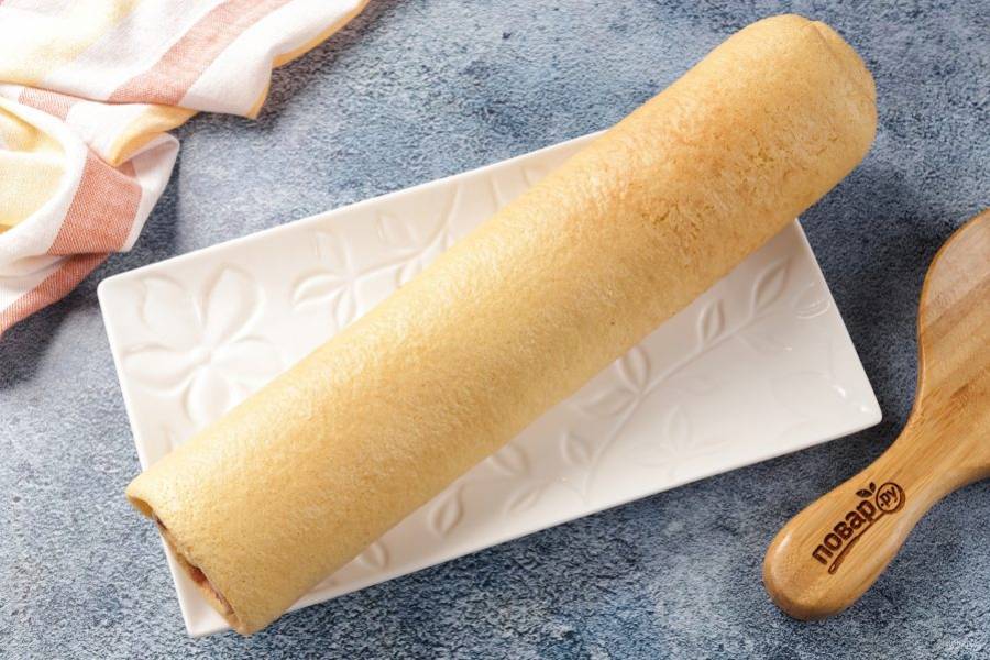 Сверните в рулет. Можно сразу же разрезать на порционные кусочки и подать на стол.