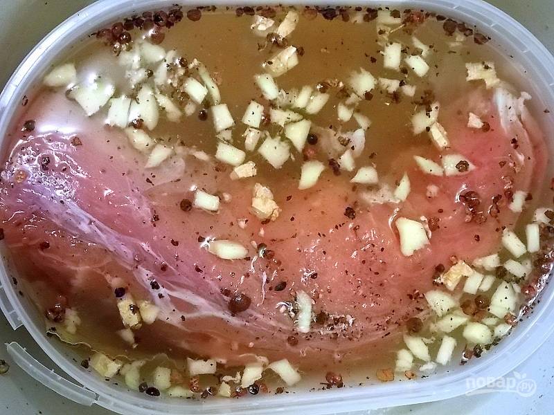У вырезки срежьте пленки, положите в маринад. Уберите в холодное место и маринуйте мясо в течение 8 часов.
