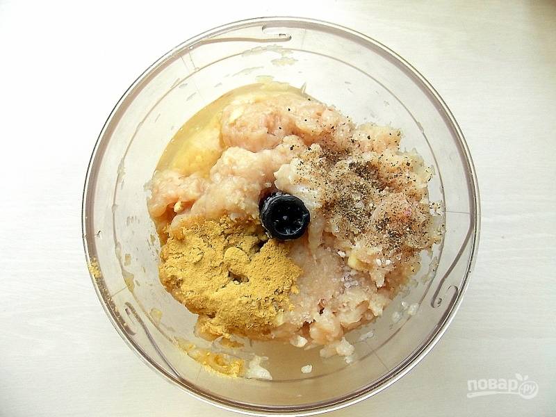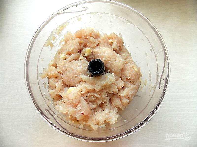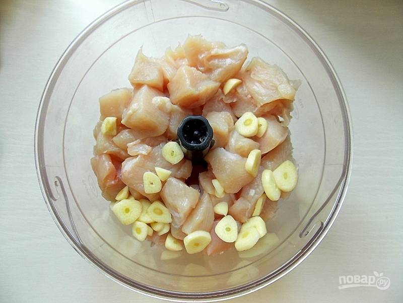 Куриное филе очистите от пленок и порежьте на кусочки. Положите в чашу блендера, добавьте нарезанный чеснок.