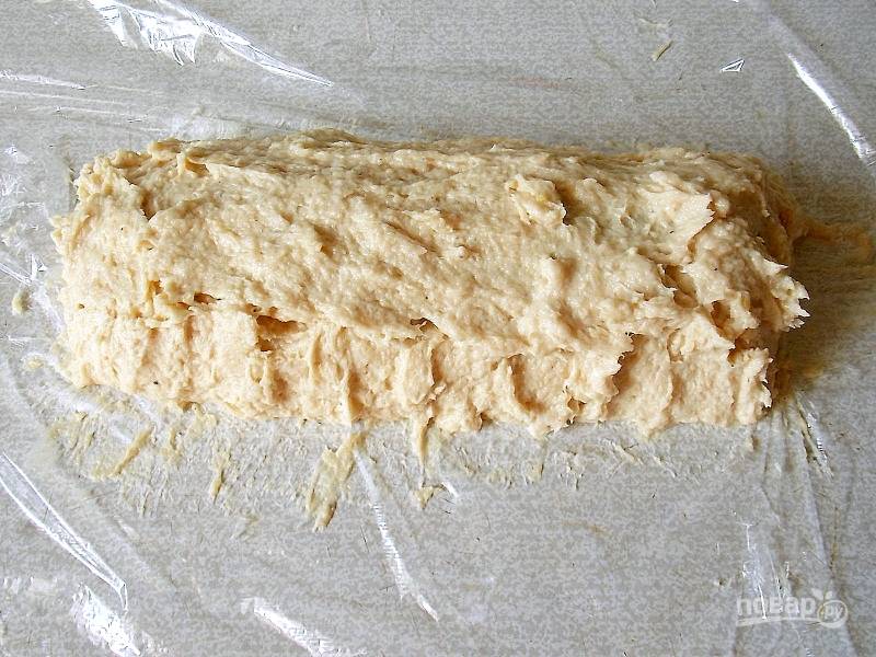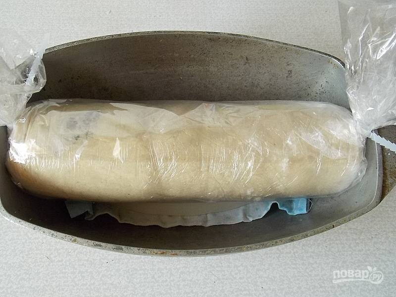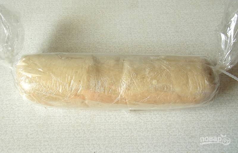 При помощи пленки сформируйте рулет и хорошенько завяжите концы. Положите в рукав для запекания, завяжите длинные концы.