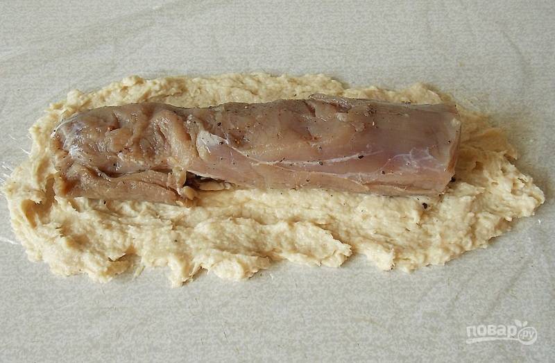 Расстелите кусок пищевого полиэтилена, выложите половину куриного фарша. Разровняйте в прямоугольник по размеру чуть больше и длиннее вырезки. Вырезку обсушите бумажным полотенцем и положите на фарш.