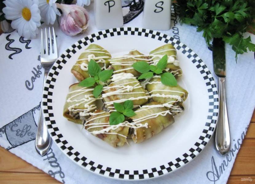 Рулетики из баклажанов с шампиньонами и сыром