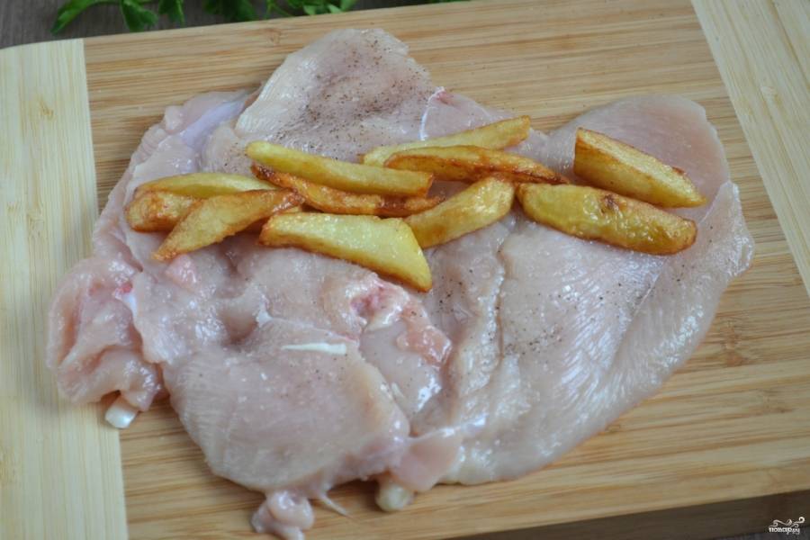 Посолите и поперчите индейку, выложите на неё дорожкой картофель фри.