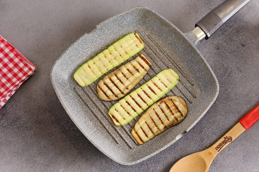 Овощи нарежьте тонкими полосками, смажьте маслом и обжарьте на сковороде гриль (можно запечь в духовке). До готовности не доводим. Задача — сделать овощи мягкими и пластичными.