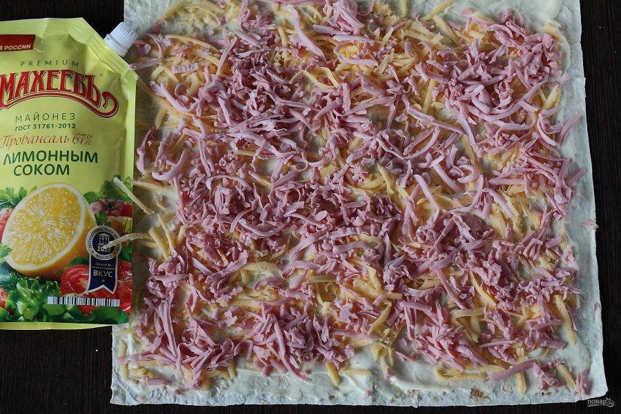 Смажьте лаваш майонезом, посыпьте тертым сыром и тертой на крупной терке колбасой.