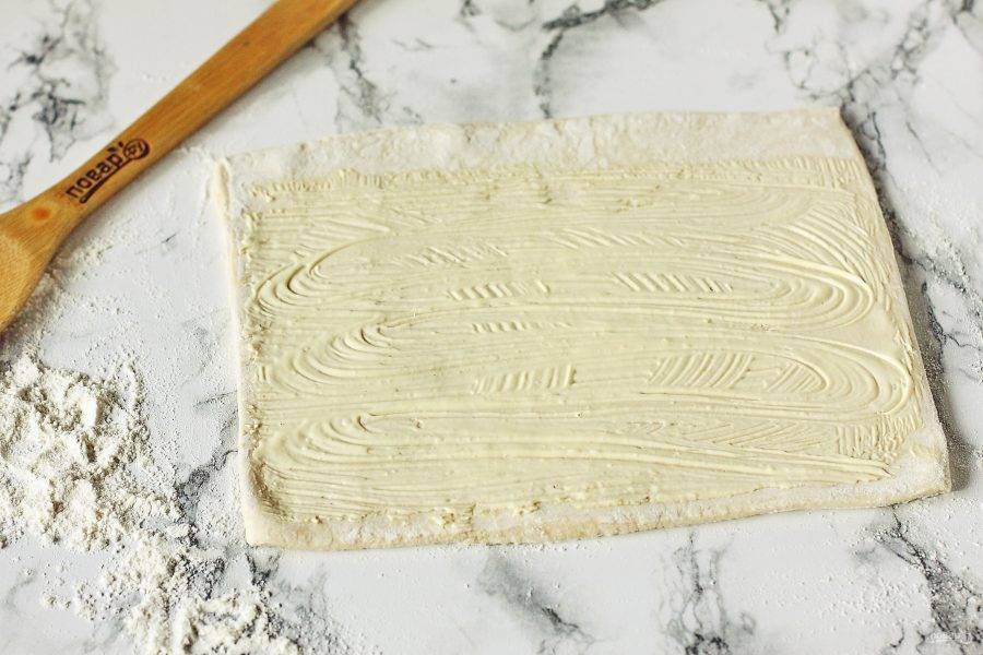 Каждый пласт теста поочередно раскатайте в форме прямоугольника на присыпанной мукой поверхности. Смажьте тесто майонезом, отступив немного от одного края.