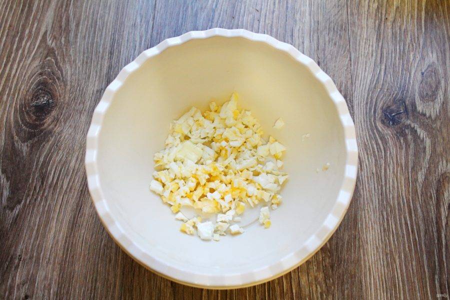 Отварите одно яйцо, остудите и очистите. Мелко его порежьте и выложите в миску.