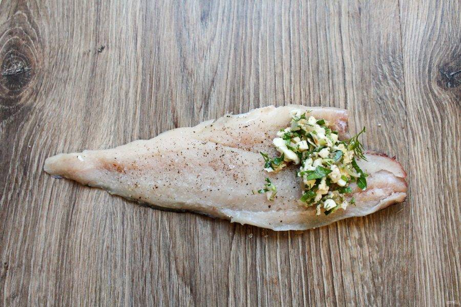 Разделите начинку на четыре части. Выложите филе, посолите и поперчите. На каждое филе выложите по одной части начинки, на широкую сторону.