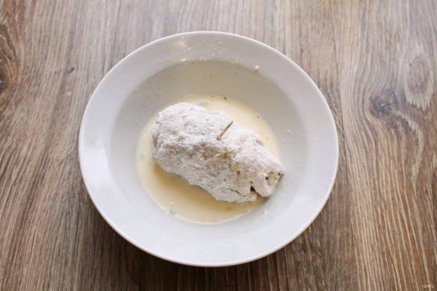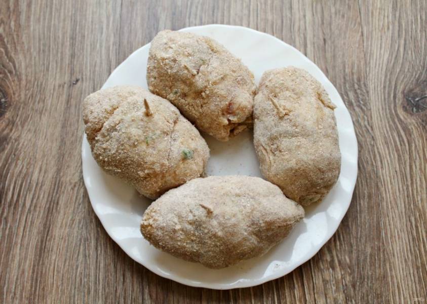 Плотно запанируйте рулетики в панировочных сухарях. Выложите в холодильник на 20 минут.