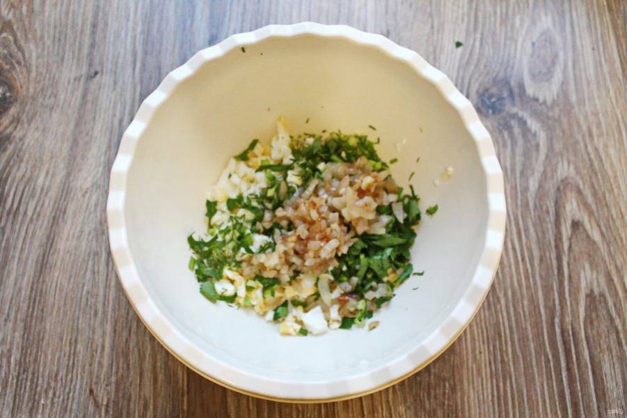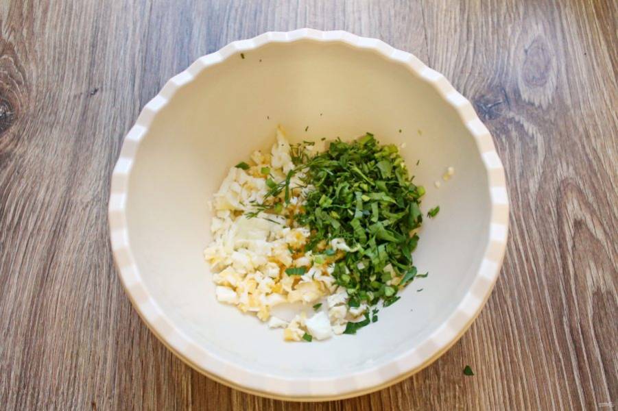 Зелень мелко порежьте и выложите в миску с яйцом.