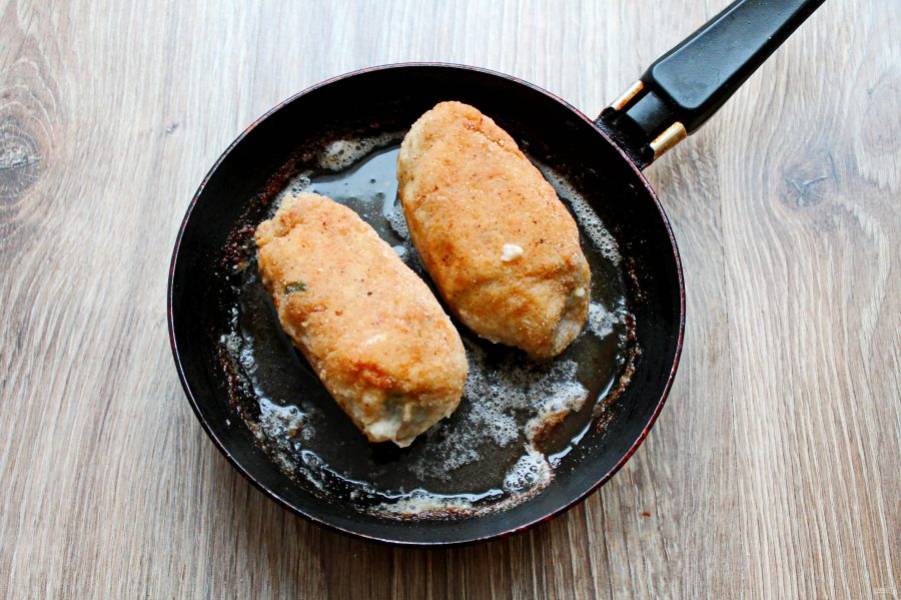В сковороду налейте оставшееся растительное масло, разогрейте на среднем огне. Убавьте огонь и обжарьте рулетики в течение 4-5 минут с каждой стороны, до румяной корочки. Переложите готовые котлеты на бумажное полотенце, чтобы убрать лишнее масло.