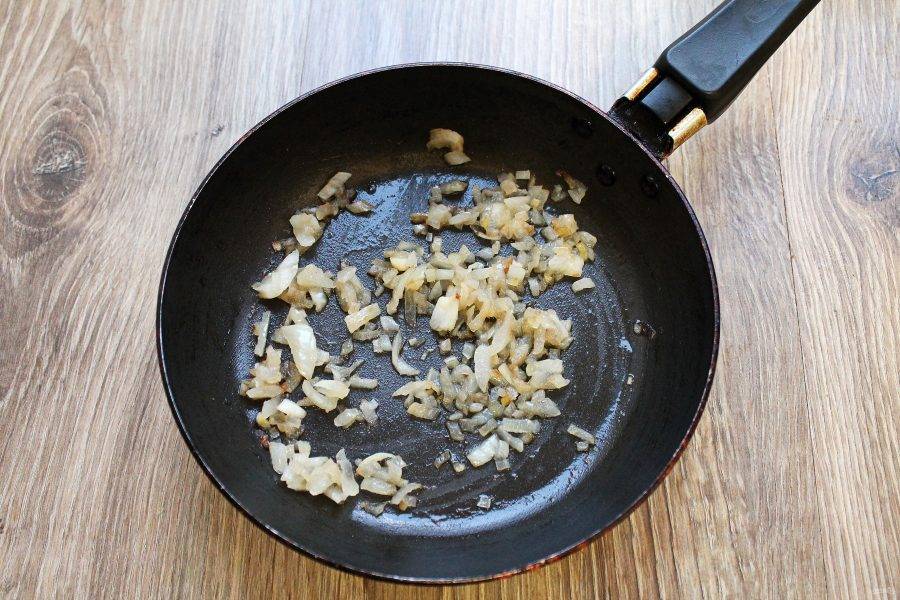 Репчатый лук почистите и мелко порежьте. В сковороду налейте растительное масло и разогрейте на среднем огне. Выложите лук и обжаривайте все в течение 5 минут, перемешивая.