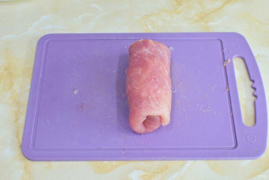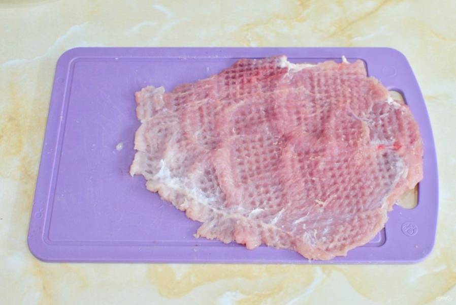 Свинину отбейте, чтобы получился тонкий кусочек. Накрывайте мясо пленкой, чтобы при отбивании не летели брызги и чтобы мясо не рвалось.