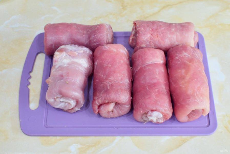 Для приготовления рулетов подготовьте необходимые ингредиенты. Чем крупнее взять мясные ломтики, тем крупнее будут сами рулеты. Но тогда они рискуют не прожариться. Выбирайте кусочки среднего размера, примерно 15*15 см.